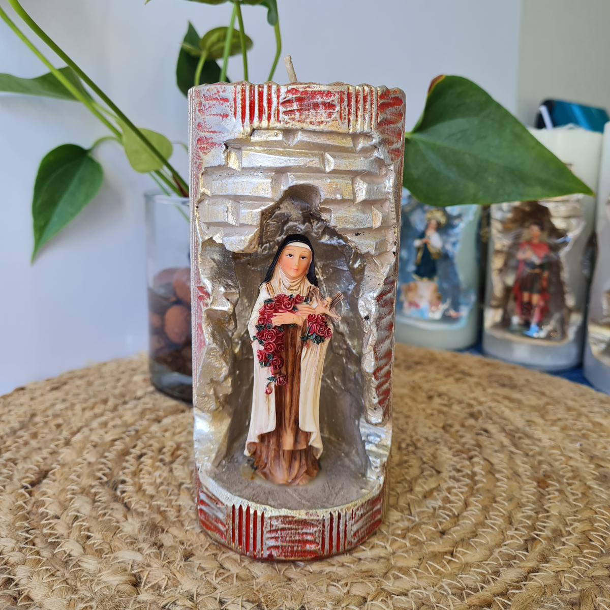 A imagem de 7 cm em resina, vem dentro de uma vela entalhada em forma de gruta e pintada manualmente. Vela 100% parafina e pavio 100% algodão.